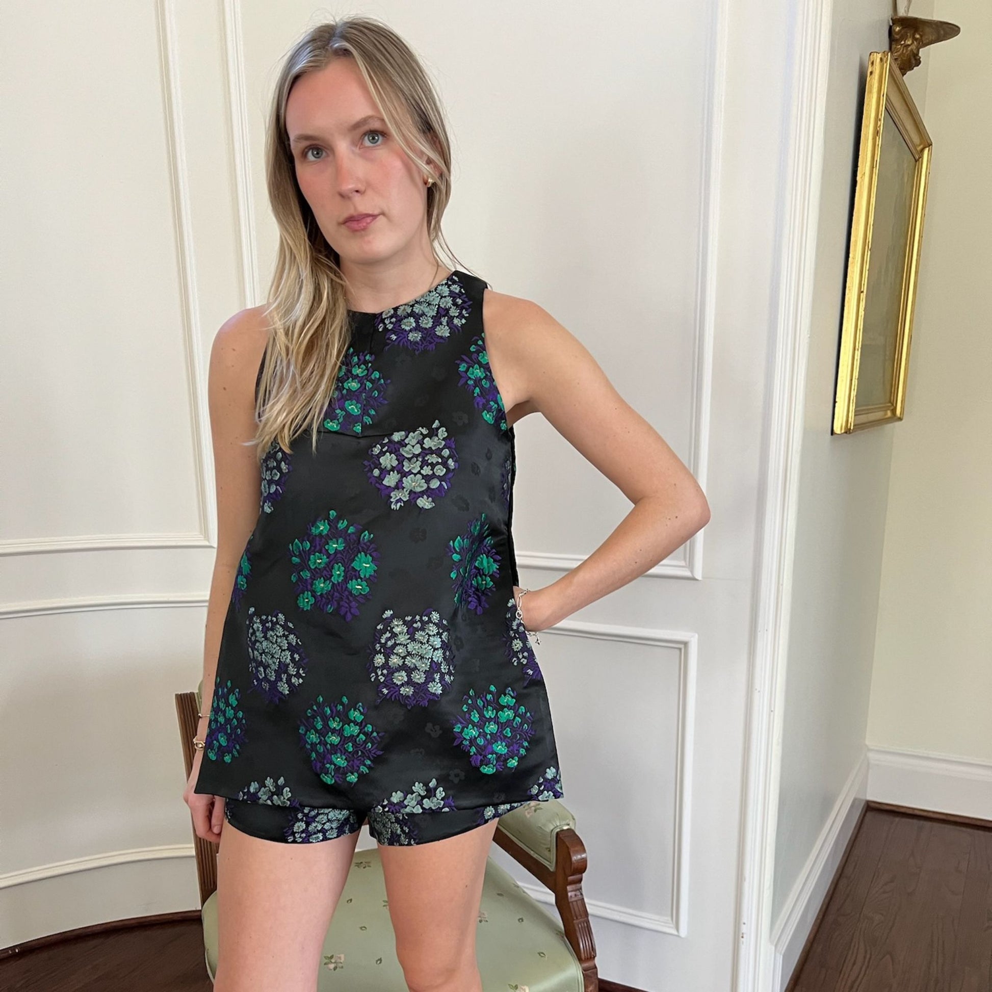 The Ashleigh Tunic set in light weight amethyst bouquet satin jacquard is our best selling dress up or down outfit. The perfect tunic paired with our Ashleigh shorts, this set is something everybody needs in their closets.