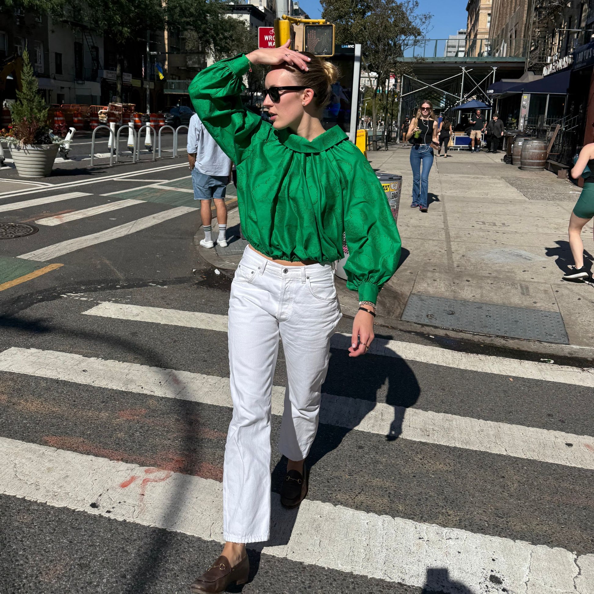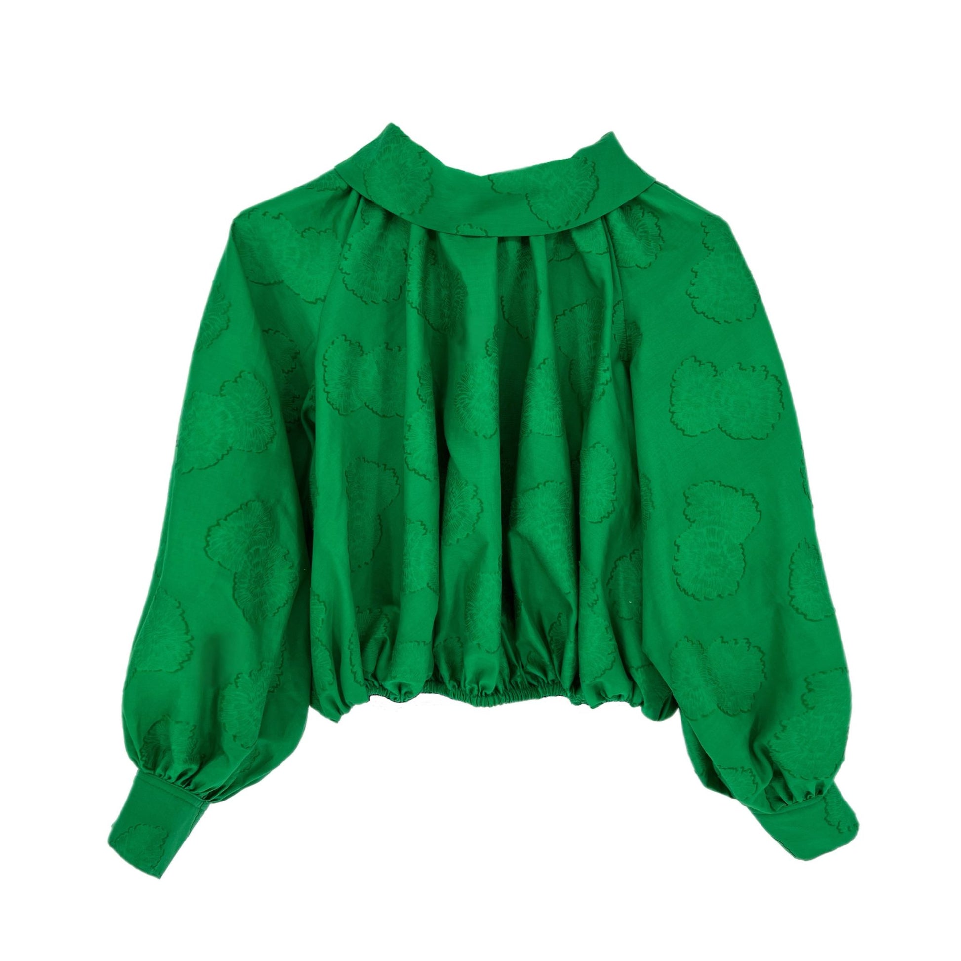 Meet Gwendolyn, a Tish Cox classic, reimagined. We’ve brought her back in a silky green cotton with jacquard flowers.